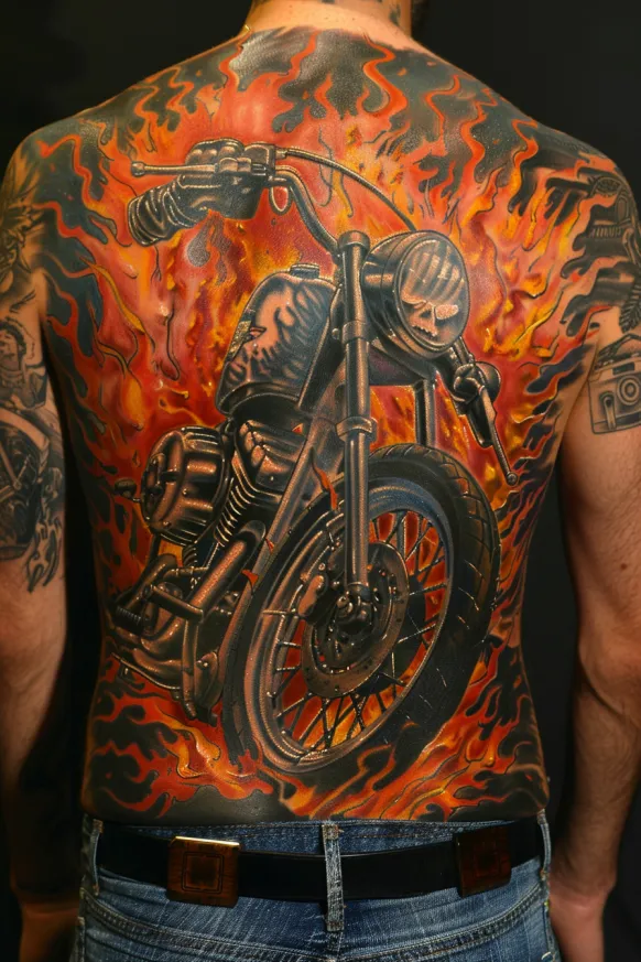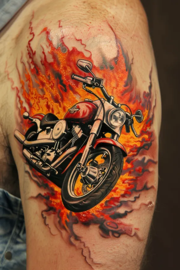 I love how this tattoo feels like pure adrenaline on skin. The vibrant color work makes it stand out from more traditional biker tattoos, giving it a modern, artistic twist. There s something about the way the background flames melt into the bike that makes it look alive and full of power. This is for someone who loves bold ink, big statements, and the open road.