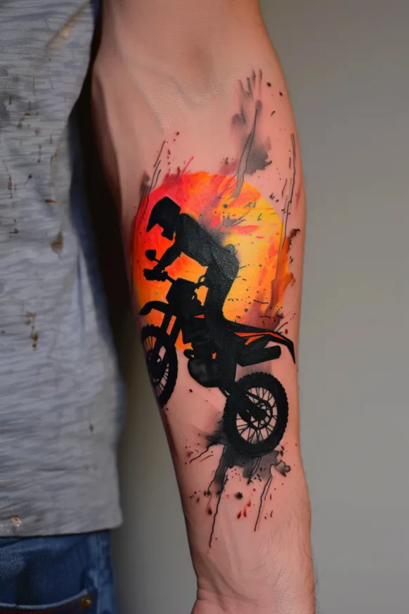 This high-energy tattoo captures the thrill of motocross in a striking black silhouette against a vibrant watercolor sunset. The bold splashes of orange, red, and yellow create the illusion of speed and movement, making it feel like the biker is soaring mid-air. The gritty splatter effect adds a rebellious edge, while the positioning on the forearm makes it a perfect statement piece for adrenaline junkies.