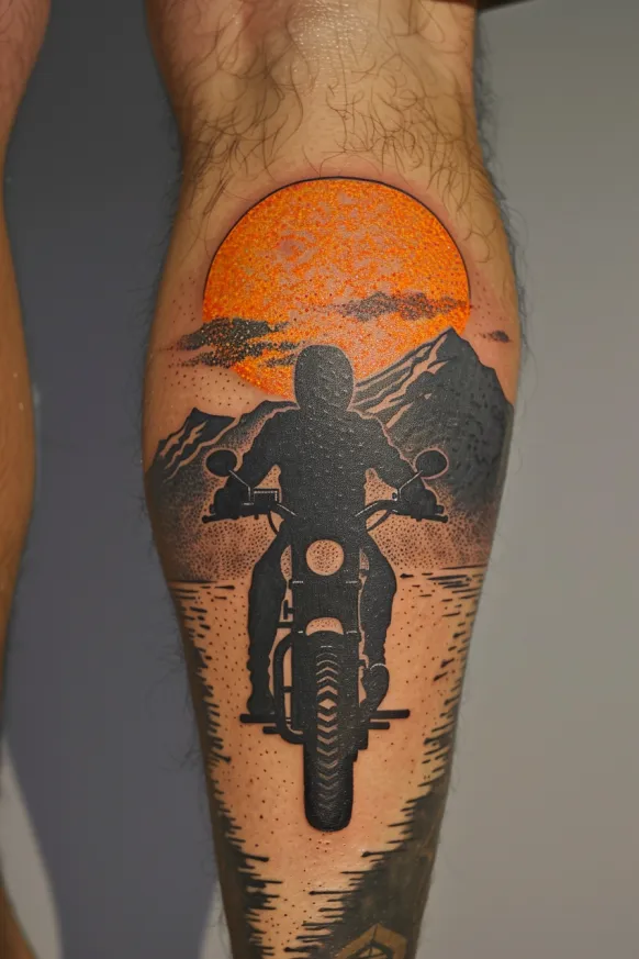 This tattoo captures the ultimate feeling of freedom on the open road. A solid black silhouette of a biker on a motorcycle rides toward the viewer, set against a stunning, textured orange sun. The dotted shading in the background creates a soft, vintage-style gradient that adds depth to the mountain landscape. The contrast between the bold black foreground and the warm sunset hues makes this design eye-catching yet timeless. Placed on the calf, it s the perfect tattoo for someone who lives for the thrill of the ride and the beauty of the journey.
