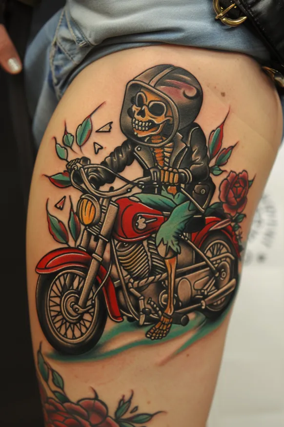 This tattoo is bold, fun, and full of rebellious energy. A skeleton biker in a classic black leather jacket grips the handlebars of a vintage red motorcycle, looking like it just rode straight out of an old-school biker comic. The helmet and tinted visor add a cool, mysterious touch, while the vibrant red roses and scattered leaves give the whole piece a dynamic, almost cinematic feel. The clean lines and rich color palette make this design pop, making it perfect for a thigh placement where every detail can shine.