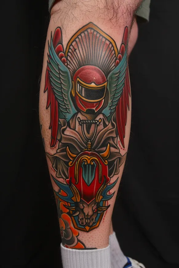 This ornate leg tattoo blends biker culture with warrior energy. A bright red motorcycle helmet with a sleek gold visor sits at the center, surrounded by majestic wings in shades of teal and deep crimson. The fan-like structure behind the helmet gives off a regal, almost divine aura, while intricate scrollwork and a sharp-edged shield at the bottom bring a medieval touch. A ram s skull embedded within the design adds a raw, untamed vibe, making this tattoo feel both protective and rebellious.