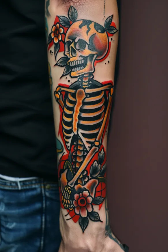 This tattoo is bold, striking, and full of classic biker attitude. A vividly inked skeleton stands tall, its bones outlined in deep black with fiery orange highlights that make it pop. A delicate rose clutched between its teeth adds a playful, rebellious charm, while the background of deep reds, blacks, and floral details ties everything together in true old-school tattoo fashion. The thick outlines and rich colors give it that timeless, vintage biker aesthetic. Placed on the forearm, it s the kind of tattoo that demands attention and never fades into the background.