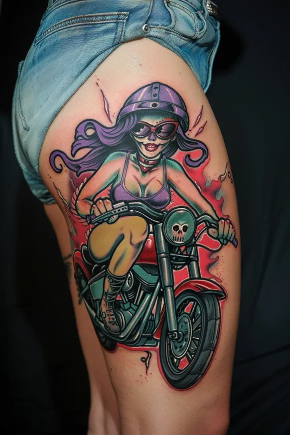 This bold and colorful thigh tattoo captures the ultimate fearless biker queen. A purple-haired woman in a matching helmet and crop top grips the handlebars of her sleek red motorcycle, leaning forward with pure adrenaline. Her sunglasses reflect the chaos of the open road, while a skull emblem on the bike s frame adds a rebellious touch. Fiery pink and red accents in the background make it look like she s leaving nothing but smoke and speed in her wake.