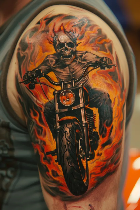 This intense and action-packed shoulder tattoo captures a flaming skeleton tearing down the road on a roaring motorcycle. The realistic detailing of the skull and the burning flames creates a sense of unstoppable motion, while the dark clothing contrasts sharply against the vibrant orange and yellow fire. The bike s front wheel seems to break through the skin, giving the entire piece a 3D effect that makes it feel alive.