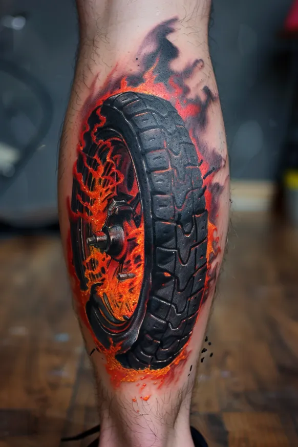 This tattoo is pure speed, adrenaline, and raw biker energy. A highly detailed motorcycle tire spins forward, surrounded by intense, blazing flames in deep reds and fiery oranges. The shading and texture on the tire give it a hyper-realistic look, making it feel almost three-dimensional. The flames wrap around the leg, creating a sense of motion and power, as if the wheel is ripping through the pavement at full throttle. Placed on the calf, this design captures the rush of the ride like nothing else.