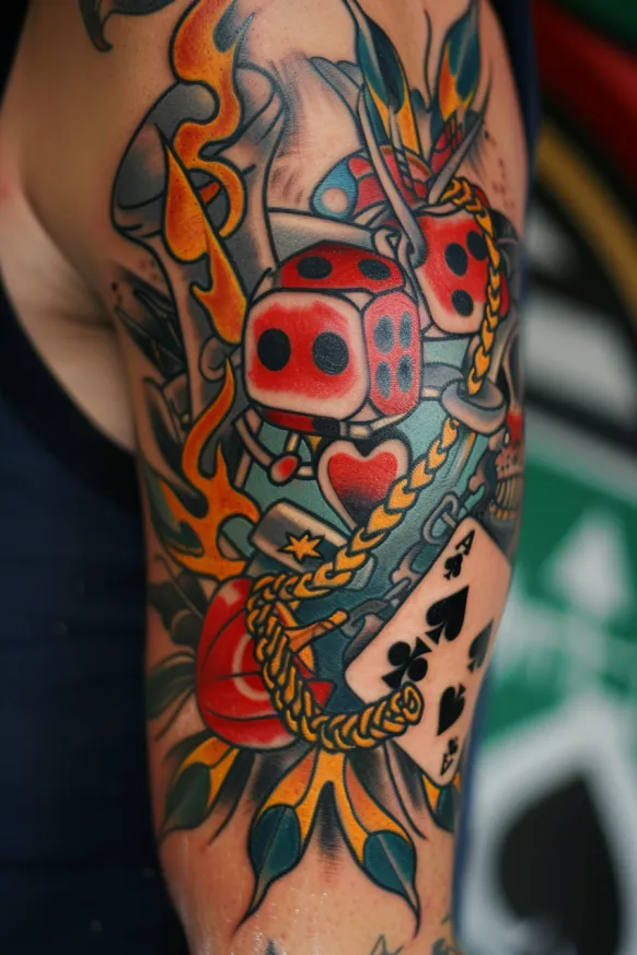 This bold and vibrant tattoo brings together classic biker and gambling elements in a stunning composition. Red dice roll through flames, surrounded by playing cards, golden ropes, and fiery accents. A pair of aces, the ultimate lucky hand, peeks through the chaos, while intricate chains and mechanical details weave everything together. The rich color palette of reds, yellows, and deep blues gives this piece an eye-catching and timeless feel.