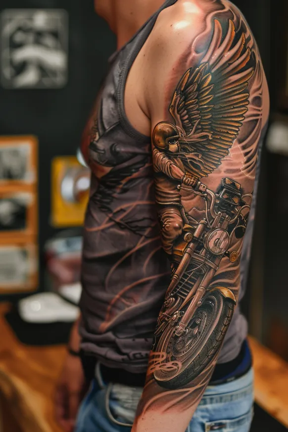 This breathtaking full-sleeve tattoo captures a powerful biker in motion, with massive angelic wings unfurling behind him. The sepia-toned shading and fine details give it a dramatic, almost divine energy, making the rider look like a guardian of the open road. The realistic motorcycle, intricate armor-like elements, and sharp feather detailing make this design a true work of art.