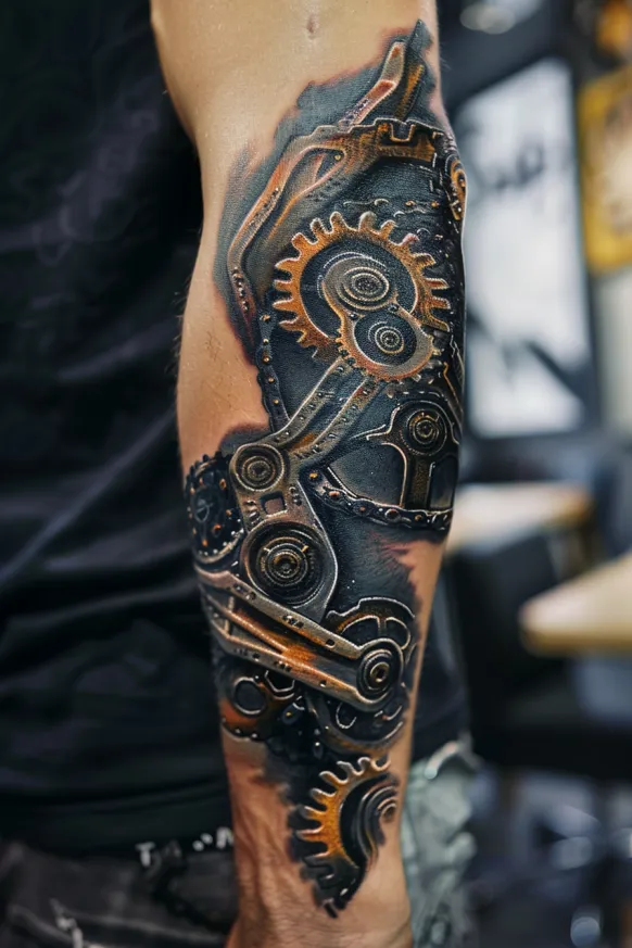 This tattoo is an absolute showstopper, blending biomechanical artistry with a raw, industrial biker aesthetic. The design creates the illusion that the skin has been peeled back to reveal a complex system of gears, chains, and mechanical components underneath. The metallic shading is incredibly realistic, with rust-toned highlights giving it a weathered, well-worn look just like a trusted motorcycle engine. Placed on the forearm, this piece demands attention and celebrates the connection between machine and rider.