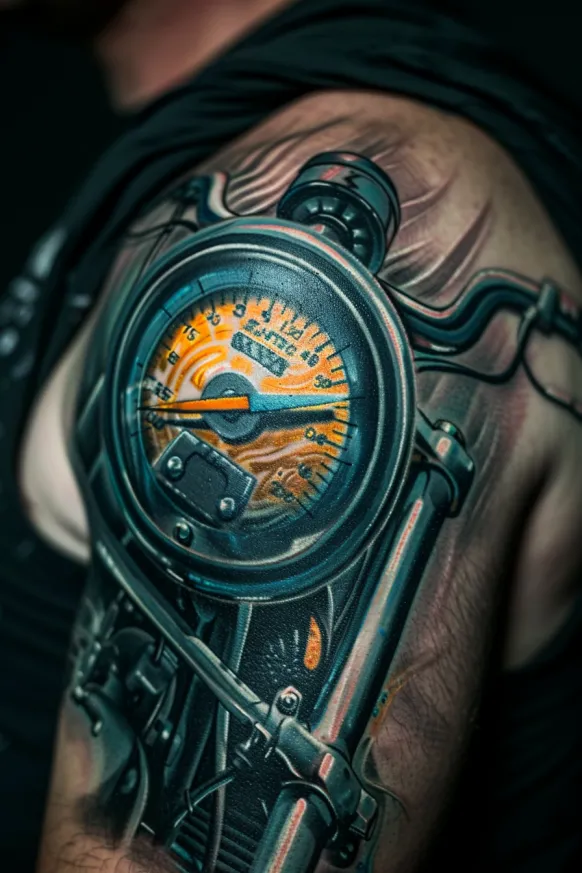 This jaw-dropping shoulder tattoo looks like a real motorcycle speedometer has been embedded into the skin. The hyper-realistic detailing, metallic shine, and glowing orange accents give it an almost three-dimensional effect. The handlebars and cables extend outward, making it feel like you re gripping the throttle, ready to hit the open road.
