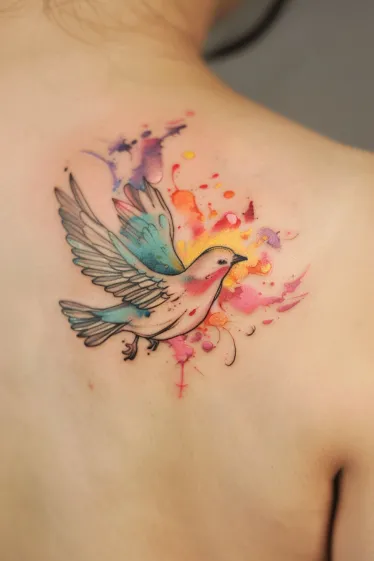This vibrant watercolor tattoo features a graceful dove soaring across the shoulder, surrounded by splashes of bright pink, orange, yellow, and blue ink. The delicate linework on the bird gives it a soft and airy feel, while the fluid watercolor shading creates an effect that looks almost painted onto the skin. The combination of warm and cool tones adds depth, making the tattoo feel light, free, and expressive. The placement on the upper back enhances the natural flow of the design, making it eye-catching yet elegant.