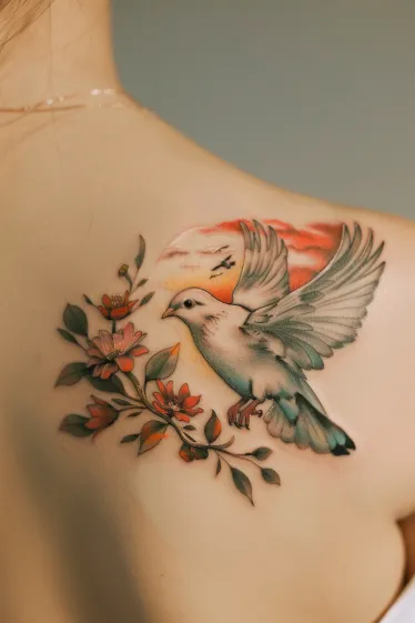 This breathtaking shoulder tattoo showcases a realistic dove in mid-flight, soaring gracefully against a warm sunset sky. The subtle shading in the dove s feathers creates a soft, lifelike appearance, while the delicate orange and pink hues of the sky add depth and emotion. Small, dainty flowers in muted coral and green tones give the design a natural and feminine touch, balancing the composition perfectly. The placement on the shoulder enhances the flow of the tattoo, making it feel effortless and elegant.