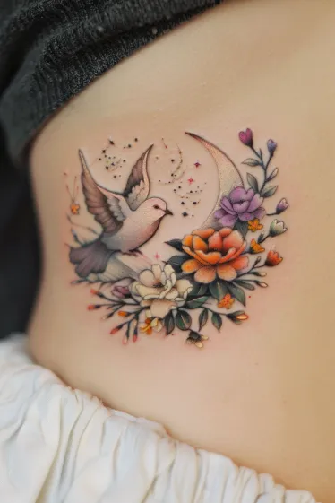 This enchanting ribcage tattoo brings together delicate femininity and celestial beauty. A graceful white dove in mid-flight is framed by a thin crescent moon, surrounded by lush, colorful flowers in soft purples, warm oranges, and creamy whites. Tiny stars and hearts are scattered around the design, adding a touch of magic and whimsy. The placement along the ribcage gives this piece an intimate, elegant feel, making it perfect for those who love tattoos that feel personal and meaningful.