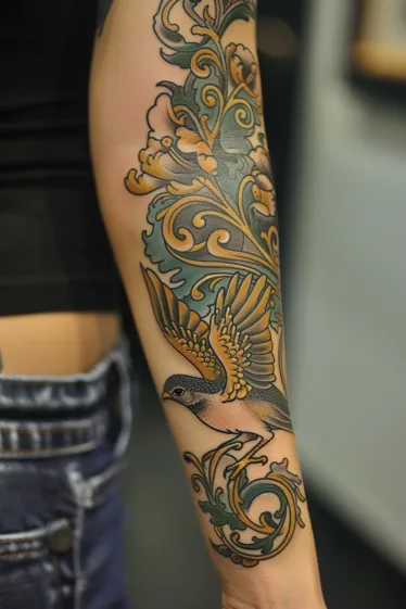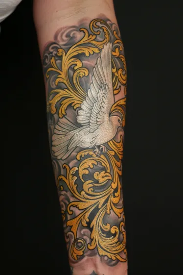 This stunning forearm sleeve brings together elegance and artistry with a beautifully detailed white dove in mid-flight. The wings stretch gracefully across the arm, blending seamlessly into intricate golden filigree patterns that swirl around it. The contrast between the ornate gold accents and the deep shading creates a luxurious feel, almost like a piece of Renaissance-inspired artwork. The balance of light and dark tones gives the design a bold yet feminine touch, making it a show-stopping choice for anyone who loves ornamental tattoo styles.