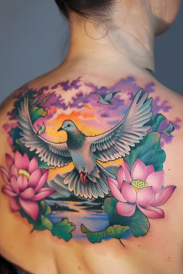 This stunning full-back tattoo is a masterpiece of color and detail. A majestic dove spreads its wings wide, soaring above a serene water landscape framed by vivid pink lotus flowers. The background is painted in soft purples, oranges, and blues, mimicking the dreamy hues of a sunset reflecting on the water. The intricate shading on the dove s feathers adds depth, making it feel as if it s about to lift off the skin. Every element in this design flows beautifully, creating a tattoo that feels alive and full of movement.