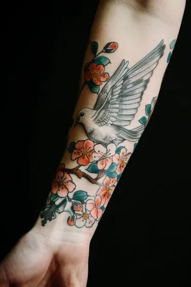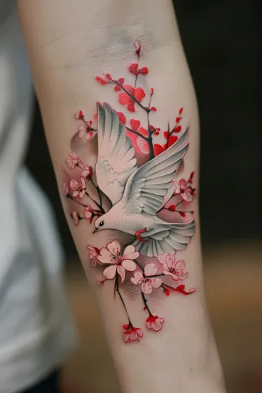 This dreamy forearm tattoo captures the beauty of spring with a gracefully soaring white dove surrounded by delicate pink cherry blossoms. The soft shading on the wings makes the bird look almost weightless, as if it s floating through a gentle breeze. The vibrant red and pink hues of the blossoms add a striking contrast, giving the whole piece a fresh and feminine feel. The fine line detailing on the petals and branches makes everything look incredibly delicate, creating a design that feels soft yet full of life.