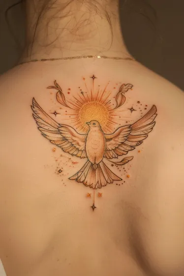 This stunning upper back tattoo showcases a graceful dove soaring toward a radiant sun, framed by delicate celestial details. The fine linework on the wings gives the dove a light, ethereal quality, while the warm golden hues of the sunburst add a glowing, almost divine presence. Tiny sparkling stars and ornamental flourishes make the design feel like something out of a celestial dream. The placement between the shoulder blades enhances the natural symmetry of the design, making it both balanced and elegant.