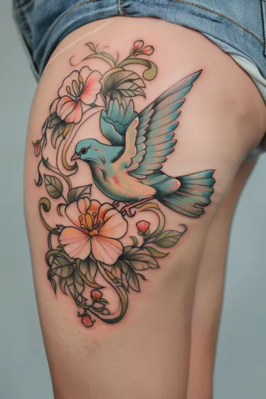 This vibrant thigh tattoo features a stunning blue and teal dove soaring gracefully among lush, blooming flowers. The soft shading on the wings gives the bird a gentle, natural movement, while the pastel peach and pink blossoms create a gorgeous contrast against the cool-toned feathers. Delicate green vines curl around the flowers, framing the design beautifully and making it feel balanced and elegant. The placement on the thigh allows for a flowing, organic composition, giving the tattoo a bold yet feminine presence.