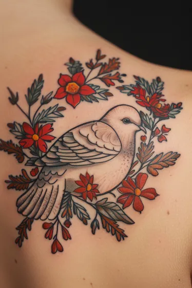 This gorgeous tattoo features a softly shaded dove, surrounded by a delicate arrangement of red and orange flowers with lush green leaves. The dove is positioned gracefully on the upper back, creating a natural flow that complements the curve of the shoulder. The fine linework in the feathers and the gentle shading on the wings and body give the bird a soft, lifelike appearance. The floral elements add a pop of color, making this design both feminine and eye-catching.