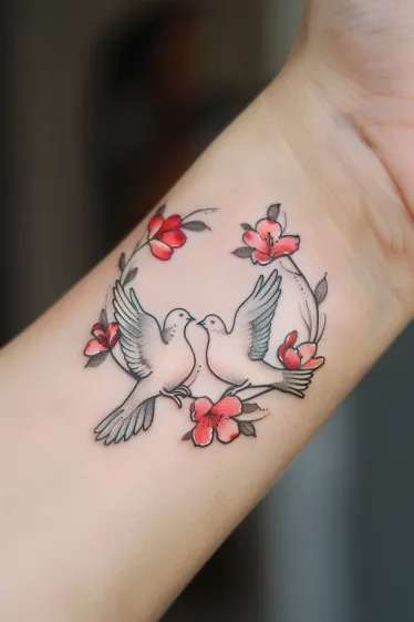 This delicate wrist tattoo features two doves touching beaks, framed by a soft wreath of tiny red blossoms and thin, leafy branches. The fine line detailing on the wings gives the birds a light, airy look, while the gentle splash of color in the flowers adds a subtle yet feminine touch. The circular composition makes the design feel balanced and harmonious, making it a perfect symbol of love, peace, and unity. The small size and elegant placement make this tattoo feel intimate and timeless.