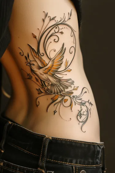 This stunning ribcage tattoo features a dove in flight, surrounded by ornate swirling designs that seem to flow with the body s natural curves. The bird s wings are detailed with soft shading, while golden accents add a warm, regal touch. The delicate filigree work gives the tattoo a sophisticated, artistic feel, making it look almost like a piece of fine jewelry etched onto the skin.