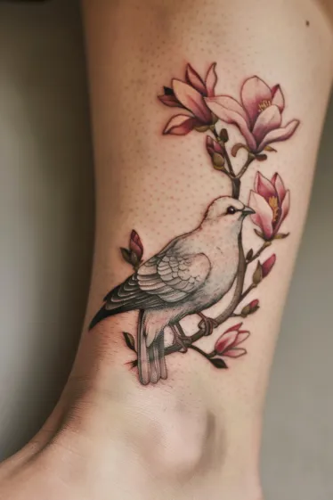 This delicate ankle tattoo features a softly shaded dove perched gracefully on a magnolia branch, surrounded by blooming pink flowers. The fine line detailing on the bird s feathers makes it look lifelike and gentle, while the rich pink hues of the magnolia petals add a feminine, romantic touch. The subtle shading and natural flow of the branch create a balanced composition, making the design feel organic and elegant. The placement along the ankle enhances its delicate and timeless aesthetic.