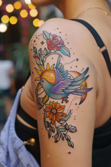 This colorful shoulder tattoo features a majestic dove soaring past a glowing sun, surrounded by lush floral details. The gradient hues of blue, purple, and yellow on the dove s wings create a dreamy watercolor effect, while the sun adds a warm golden glow. Tiny geometric sparkles and soft shading give this piece a whimsical, almost storybook-like charm. The bold floral elements wrap around the shoulder beautifully, making the design feel balanced and eye-catching from every angle.
