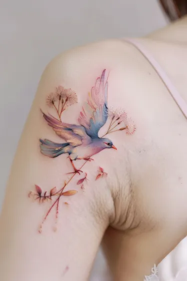 This delicate shoulder tattoo features a dreamy watercolor dove in soft pastel hues, surrounded by gentle botanical details. The bird s feathers transition beautifully from cool blue to soft pink, blending seamlessly with the surrounding wispy flowers and branches. The light, airy strokes create a barely-there effect, making the tattoo feel like a painting on skin. The placement on the shoulder adds a natural flow and elegance, giving the design a soft and ethereal charm.