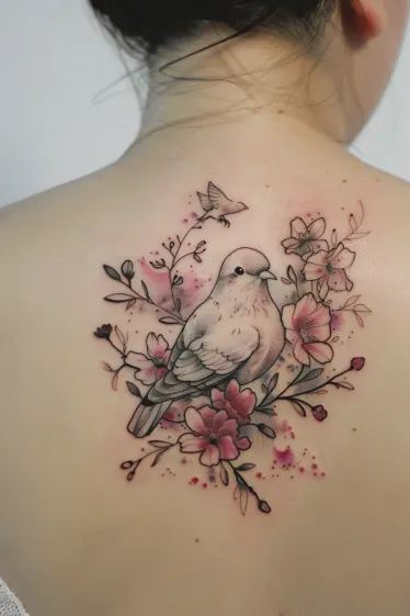 This breathtaking upper back tattoo features a serene white dove perched delicately among soft pink cherry blossoms. The fine line detailing on the feathers adds a gentle, lifelike quality, while the subtle watercolor shading in the background gives it a dreamy, romantic feel. The light pink ink splashes around the flowers create a soft, almost ethereal effect, making it look as if the dove is part of a delicate spring breeze. The placement on the upper back enhances the design s flow, allowing the artwork to feel graceful and natural.