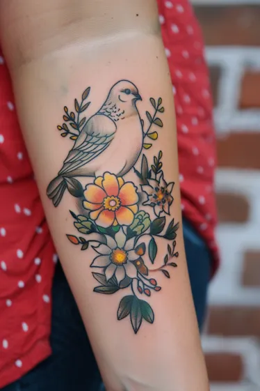 This soft yet structured forearm tattoo showcases a serene dove resting among lush flowers. The fine linework and muted shading give the dove a gentle, peaceful appearance, while the bold outlines and warm yellow blooms add a pop of vibrancy. Subtle leafy details frame the design, making it feel balanced and harmonious. The placement on the forearm allows the natural shape of the design to flow beautifully, following the curve of the arm.
