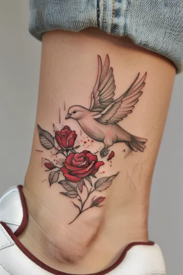 This graceful ankle tattoo features a delicately shaded dove in mid-flight, hovering over a pair of vibrant red roses. The fine line detailing on the feathers gives the bird a soft, elegant touch, while the deep red petals and subtle splashes of ink create a bold, eye-catching contrast. The placement near the ankle makes this design feel subtle yet stylish, adding a touch of feminine charm and symbolism to the area. The shading and linework make the elements blend beautifully, creating a balanced and timeless look.
