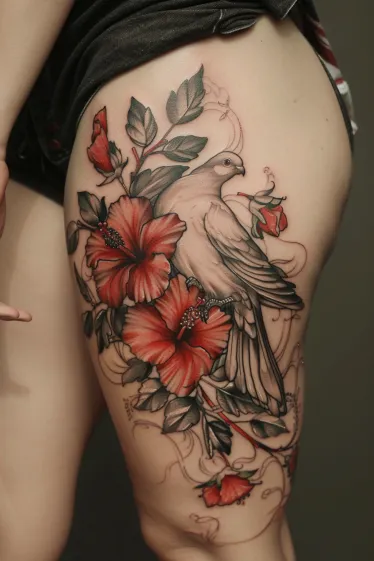 This breathtaking thigh tattoo features a graceful dove perched among lush hibiscus flowers, blending soft realism with delicate shading. The deep red petals create a striking contrast against the muted gray tones of the dove, making it the focal point of the design. The subtle vine details weave through the piece, adding a sense of movement and elegance. Placed along the thigh, this tattoo has a flowing, natural composition that enhances the body s curves beautifully.