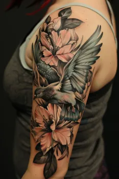 This striking half-sleeve tattoo features a majestic dove in mid-flight, surrounded by lush, oversized flowers in muted pink and deep black tones. The shading on the dove s wings gives it a realistic, almost ethereal feel, while the dark leaves and petals add contrast, making the lighter tones pop. The detailed linework and soft gradients create depth, making the design feel dramatic yet elegant. This tattoo flows naturally along the arm, enhancing the feminine and bold aesthetic.