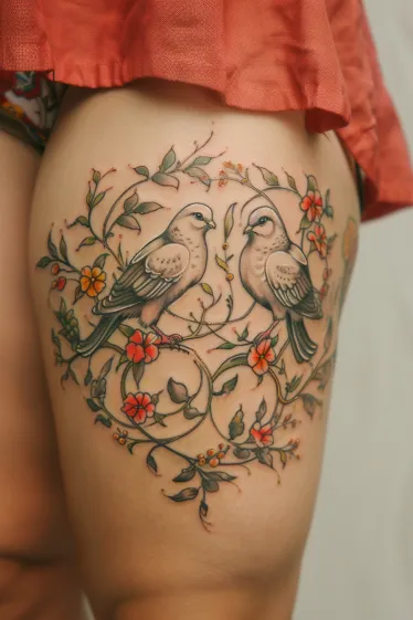 This enchanting thigh tattoo features two doves perched within an intricate wreath of delicate vines and flowers. The birds are positioned symmetrically, creating a harmonious balance that enhances the design s elegance. Soft earthy tones and subtle shading give the piece a natural, organic feel, while the winding floral details add a touch of whimsy. The placement on the thigh allows for a grand, yet graceful look, making this tattoo both striking and deeply feminine.