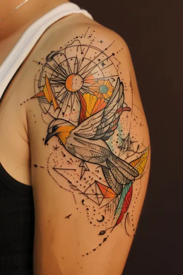 This bold and artistic upper arm tattoo blends a majestic dove in flight with intricate geometric designs and celestial motifs. The dove s wings are detailed with fine dotwork and line shading, while its feathers transition into vibrant splashes of yellow, orange, red, and blue, creating a stunning color contrast. Surrounding the bird is a cosmic-inspired background, featuring a stylized sun, planets, constellations, and abstract linework, making it feel both whimsical and futuristic. The combination of precision and free-flowing design gives this tattoo a one-of-a-kind, modern edge.