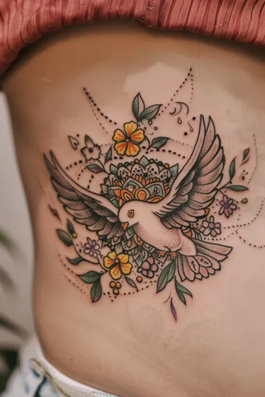This stunning side rib tattoo features a beautifully detailed dove in mid-flight, surrounded by a delicate mandala pattern and blooming florals. The soft shading on the dove s feathers gives it a light, airy quality, while the intricate mandala details add depth and elegance. The floral elements, in soft yellow and green hues, make the design feel organic and feminine. Tiny dotted accents and swirling leaves create a sense of movement, making the artwork look as if it s naturally flowing with the body s curves.