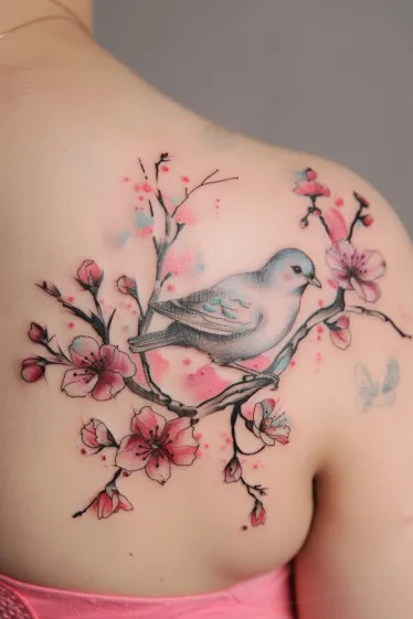 This soft and elegant shoulder tattoo features a beautifully shaded dove resting on a delicate cherry blossom branch. The fine black-and-grey detailing on the bird contrasts with the soft pink watercolor splashes of the blossoms, giving the whole design a gentle, artistic feel. The thin, graceful branches extend across the upper back, making the placement feel natural and feminine. Tiny ink splashes add a touch of whimsy and movement, making it look like the flowers are gently drifting in the wind.