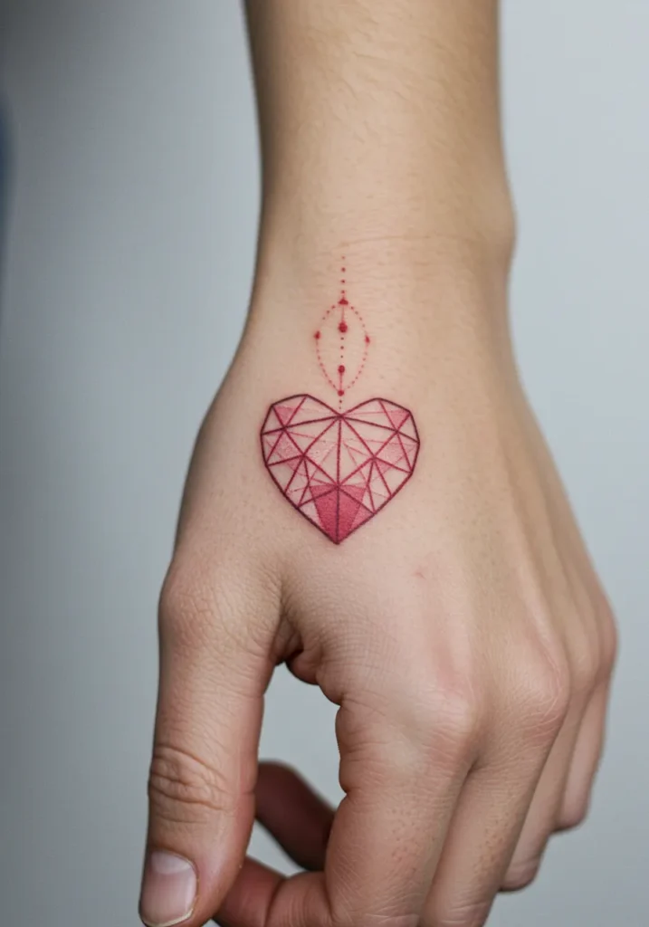 This beautiful hand tattoo features a heart shape made up of fine geometric lines, giving it the look of a sparkling gem or crystal. The soft red shading inside the heart brings the design to life, while tiny dotted elements above the heart add a little extra magic. I love how the sharp angles and perfect symmetry balance out the sweetness of the heart, making it feel both bold and delicate at the same time.