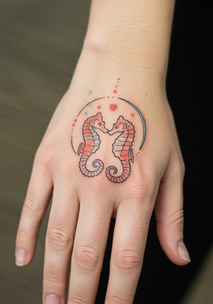 This charming tattoo design features two adorable seahorses facing each other, their curled tails mirroring one another perfectly. Fine black lines give shape and detail to their delicate bodies, while soft coral tones bring a gentle warmth to the piece. A tiny heart floats above them, surrounded by dotted lines and curved shapes that add a playful, whimsical feel. The placement across the hand makes it feel like a sweet little symbol of love and connection you can carry with you at all times.