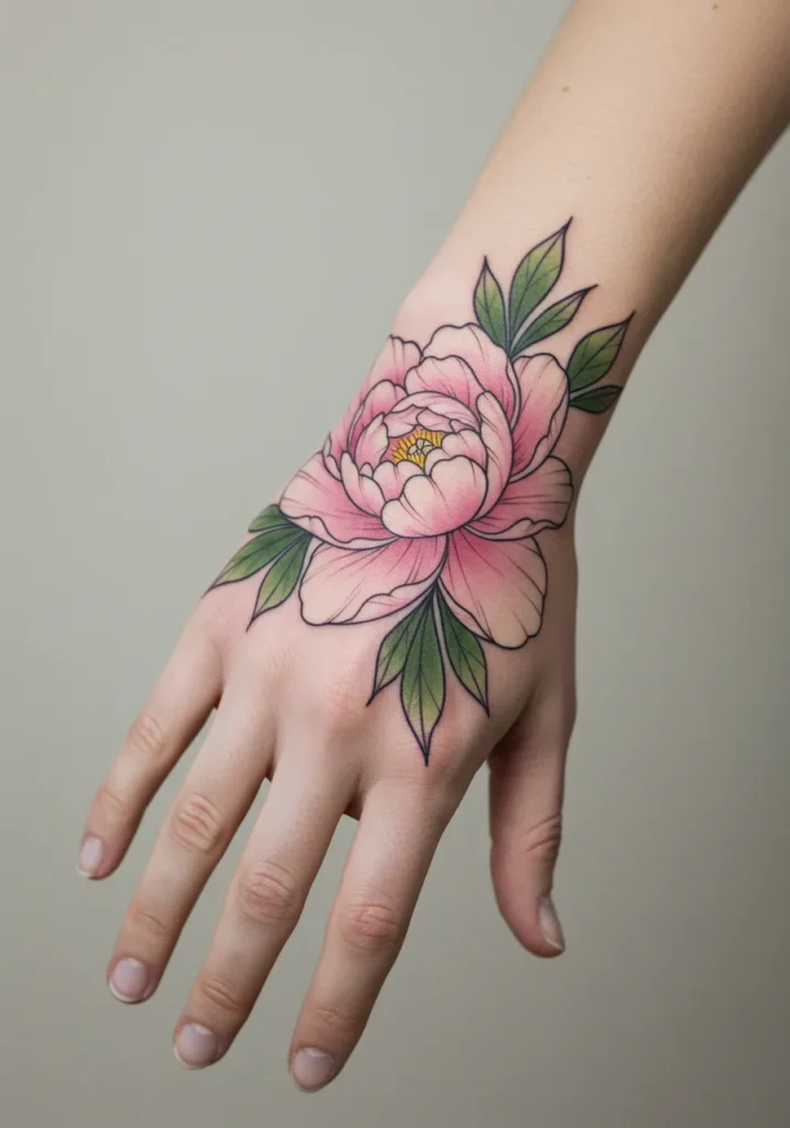 This gorgeous hand tattoo shows off a blooming peony, rich with soft pink petals that layer so beautifully around a golden yellow center. The fine black outlines keep the design crisp and clean, while the green leaves bring just the right amount of contrast. I love how the placement lets the flower gently spread from the wrist onto the top of the hand, almost like it s naturally growing there. The shading is so soft and subtle, giving the petals a delicate, watercolor-like feel without losing that fine line sharpness.