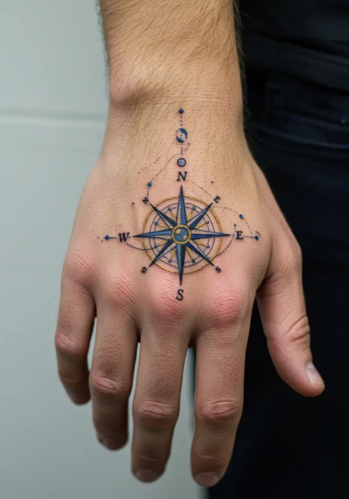 I love how this tattoo feels adventurous but also super thoughtful. A compass always gives me those follow your own path kind of feels, and having it right there on your hand is such a sweet little reminder to trust your own direction. It s simple, meaningful, and honestly just so cool.