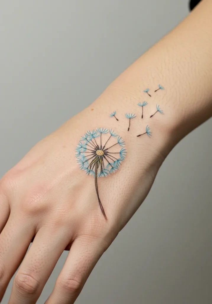 This delicate dandelion tattoo captures that magical moment when the seeds lift off and float away in the breeze. The design is soft and airy with fine, crisp lines that bring out every tiny detail of the seed structure. Light blue adds a gentle pop of color to the seeds, while the center of the flower holds a soft golden tone that ties the whole piece together so beautifully. The placement on the hand makes the floating motion feel extra real, almost like the seeds are actually drifting up the wrist.