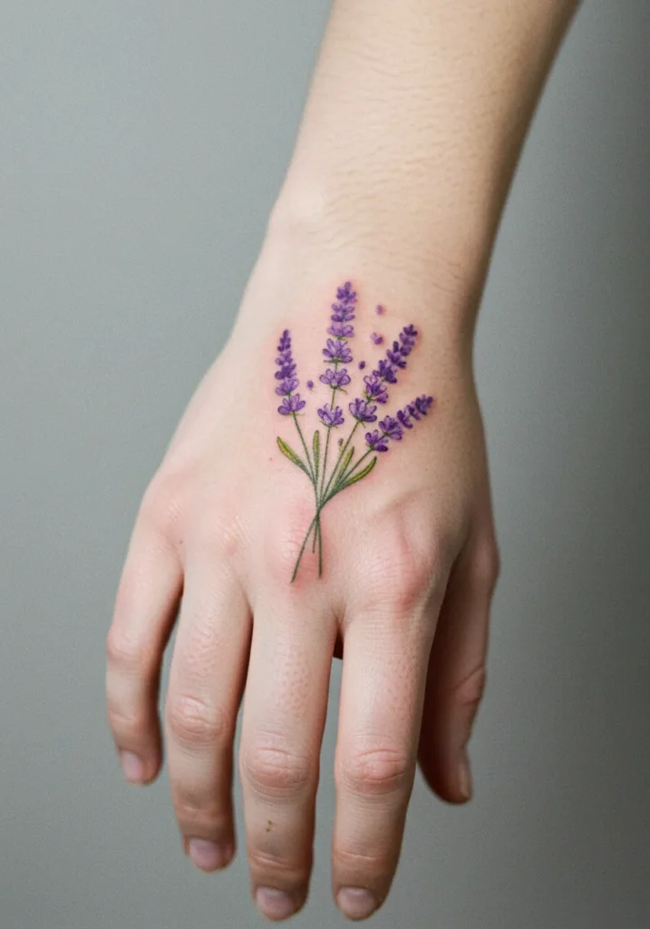 This beautiful hand tattoo showcases a delicate bouquet of lavender sprigs, carefully crafted with soft fine lines and lovely shades of purple and green. Each tiny flower is detailed with care, and a few floating petals add a sweet little touch of motion. The color is vibrant without feeling too bold, giving the whole piece a soft, natural elegance. The placement across the back of the hand makes it feel like you re carrying a tiny garden with you everywhere you go.