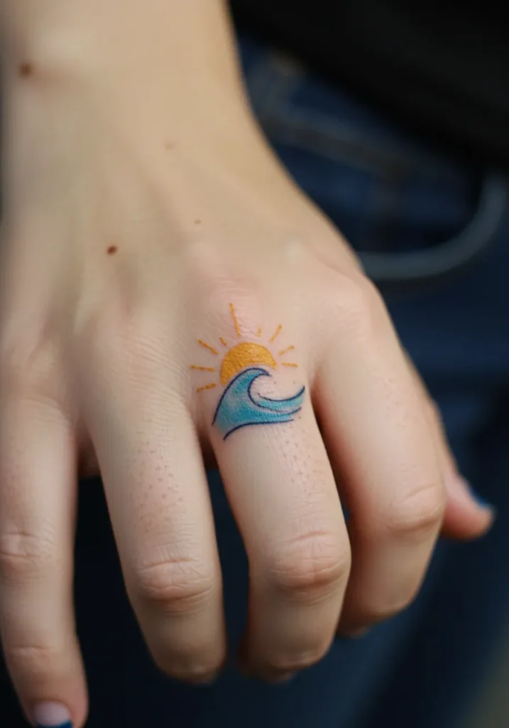 This sweet little finger tattoo features a crisp fine line wave curling up beneath a bright orange sun. The sun s rays are spaced evenly, adding a playful burst of energy that feels like summer bottled up into one tiny piece of art. Soft blue tones give the wave just enough color to make it pop, while the clean linework keeps the whole design simple and polished. Its small placement between the fingers makes it feel like your own secret reminder of sunshine and salty air.