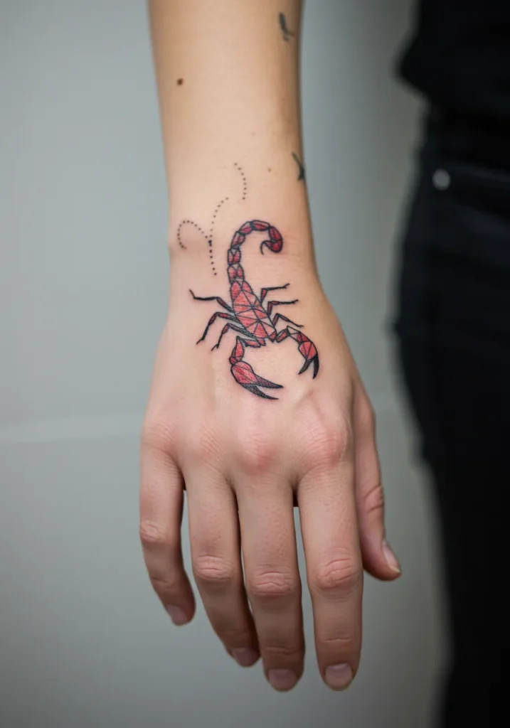 Geometric Scorpion Fine Line Hand Tattoo