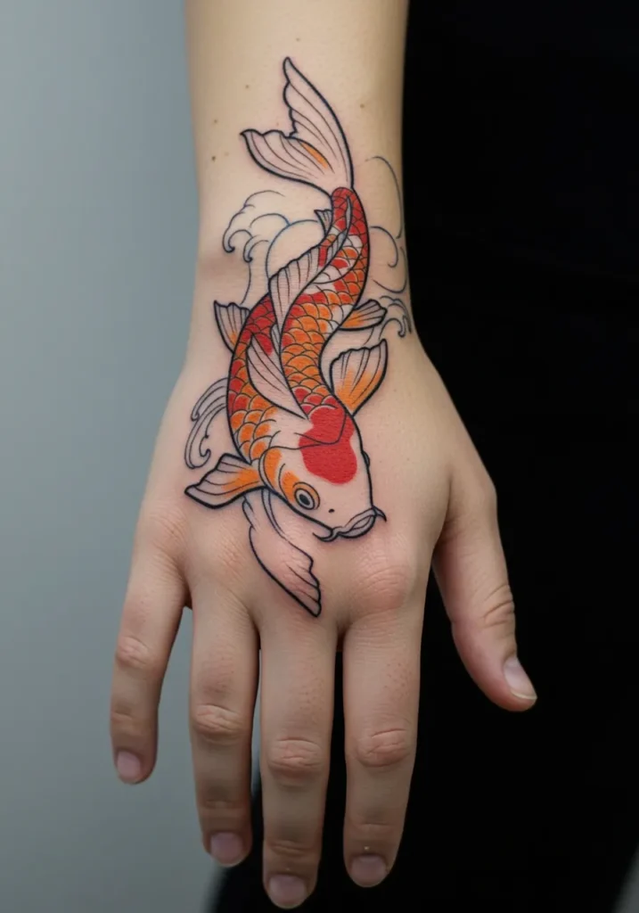 I have such a soft spot for koi fish tattoos because they always feel like a symbol of strength and perseverance but still carry this calm, peaceful energy. This one especially feels powerful but not aggressive, with just the right amount of color to keep it bold without being too heavy. I love how it looks like a little piece of art you can wear every single day, and honestly, it s just so gorgeous on the hand.