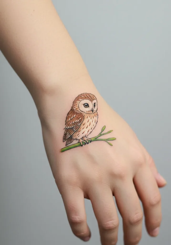 This adorable tattoo features a tiny owl perched sweetly on a slim green branch, placed right across the back of the hand. The owl is brought to life with soft brown feathers, gentle shading, and those big round eyes that give it so much personality. The fine line details around the feathers and branch keep the whole design feeling light and delicate, while the soft color palette makes it pop just enough without overpowering the hand.