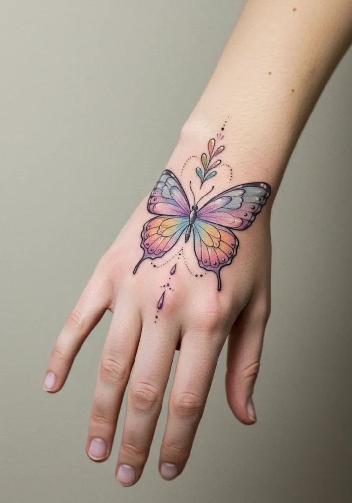 This gorgeous butterfly tattoo spreads its wings right across the top of the hand, showing off a soft rainbow of pastel colors blended together in a dreamy watercolor style. The fine line outlines keep the wings crisp and elegant, while the tiny dotted details and leafy accents add such a pretty flow to the whole design. The colors shift from gentle pinks and purples to light blues and yellows, making the butterfly feel almost like it s glowing against the skin.