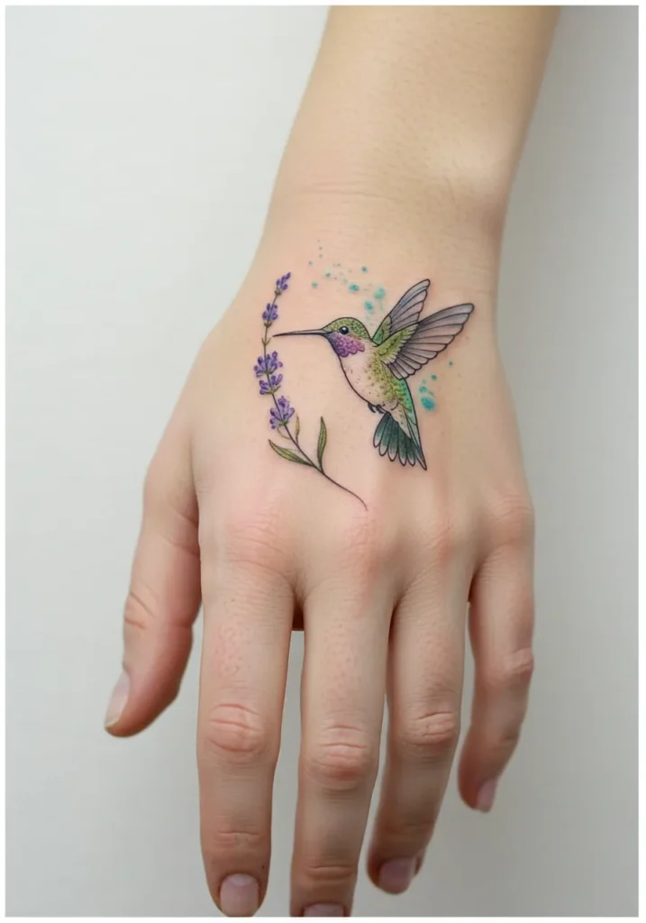 This sweet little tattoo captures a hummingbird frozen in mid-flight, reaching its delicate beak toward a soft sprig of lavender. The fine linework keeps the design feeling light and graceful, while the soft greens, purples, and pinks add the prettiest splash of color. Tiny aqua-blue dots float in the background like a soft breeze, giving the whole piece an extra sense of motion and life. The placement on the back of the hand makes it feel like this tiny bird is always fluttering close by.