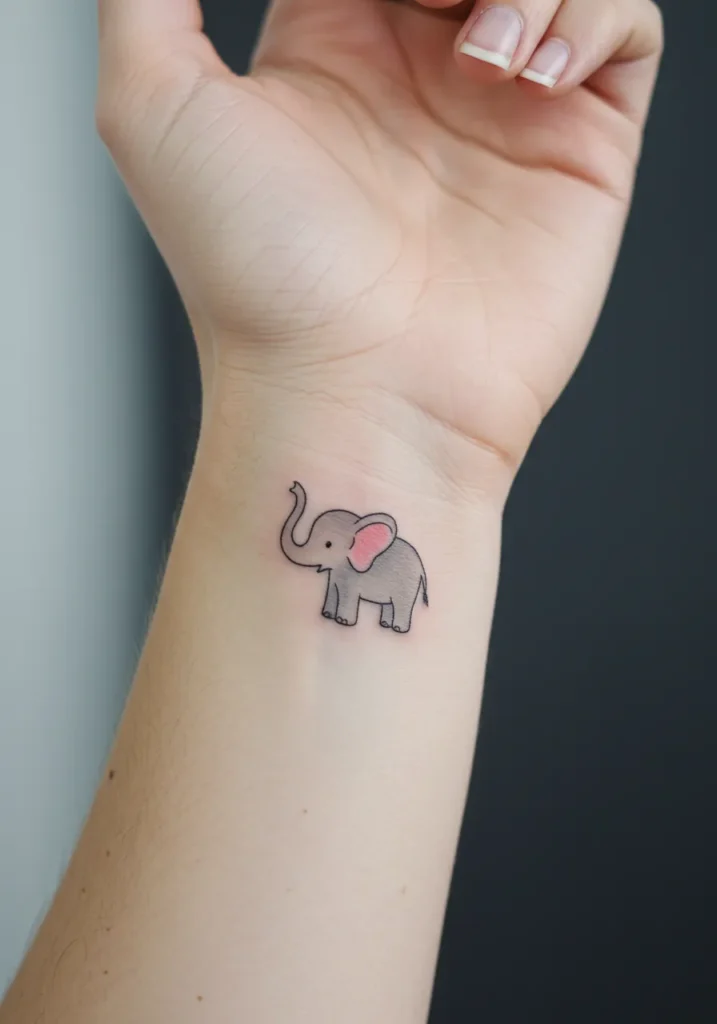 This charming little tattoo features an adorable baby elephant, outlined in soft fine lines with gentle gray shading and the sweetest touch of pink on the ears. The design is tiny and perfectly placed on the inner wrist, making it feel personal and almost like a tiny good-luck charm you get to carry around every day. The elephant s raised trunk adds an extra dose of happy vibes, symbolizing positivity and strength in the cutest way possible.