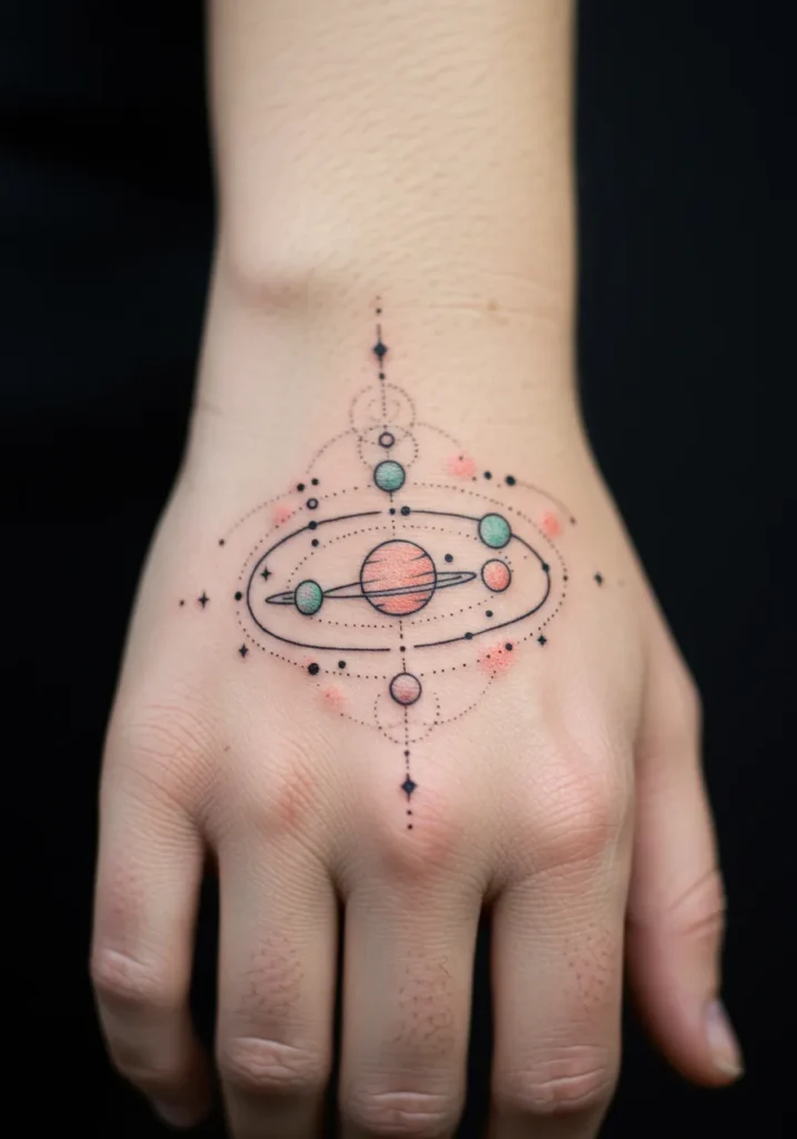 This tattoo features a stunning planetary orbit design right across the top of the hand. The fine linework creates delicate pathways connecting softly colored planets, all circling around a central ringed planet. Tiny dotted lines and mini starbursts give the whole piece a cosmic flow, while soft blush pinks and muted greens add a beautiful pop of color without overpowering the simplicity of the design. It feels perfectly balanced between structure and playfulness.